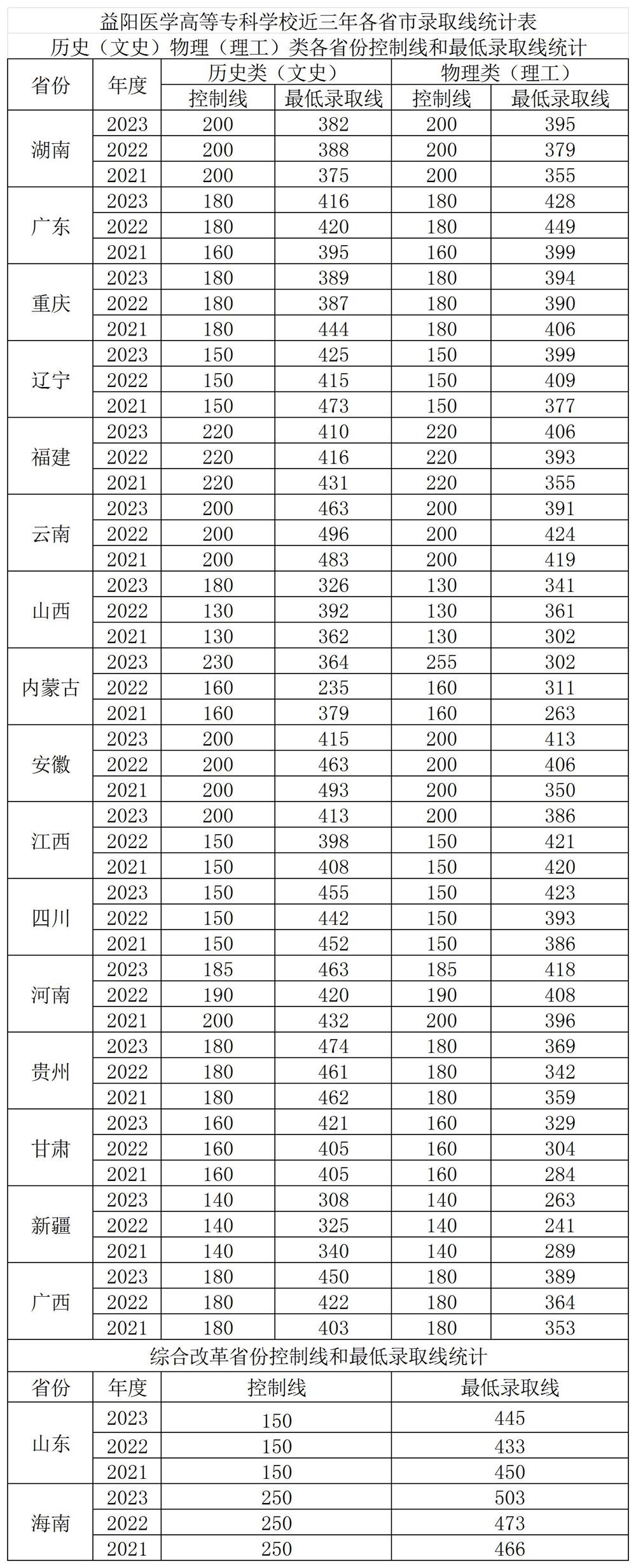 益阳医学高等专科学校近三年(2021-2023)录取分数线