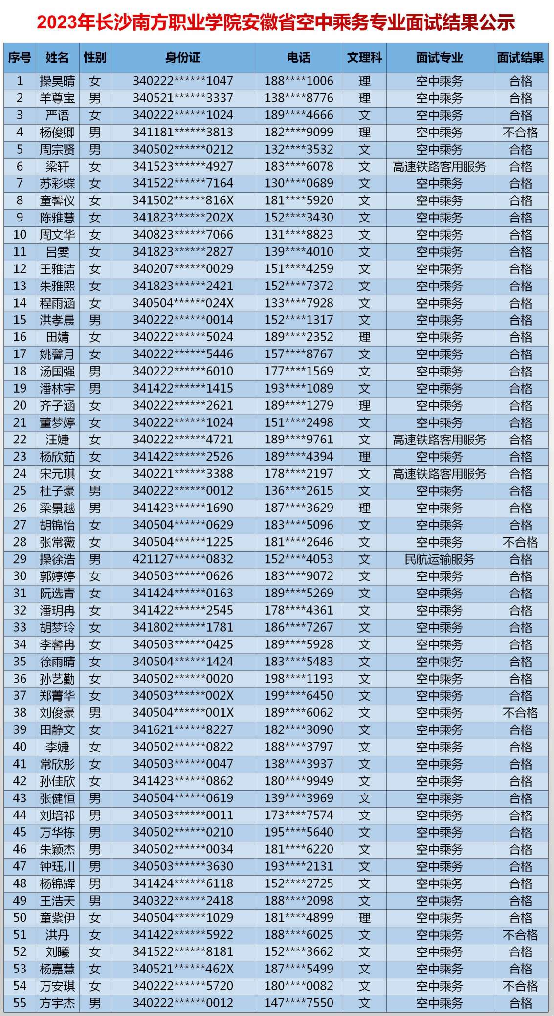 2023年长沙南方职业学院安徽省空中乘务专业面试结果公示