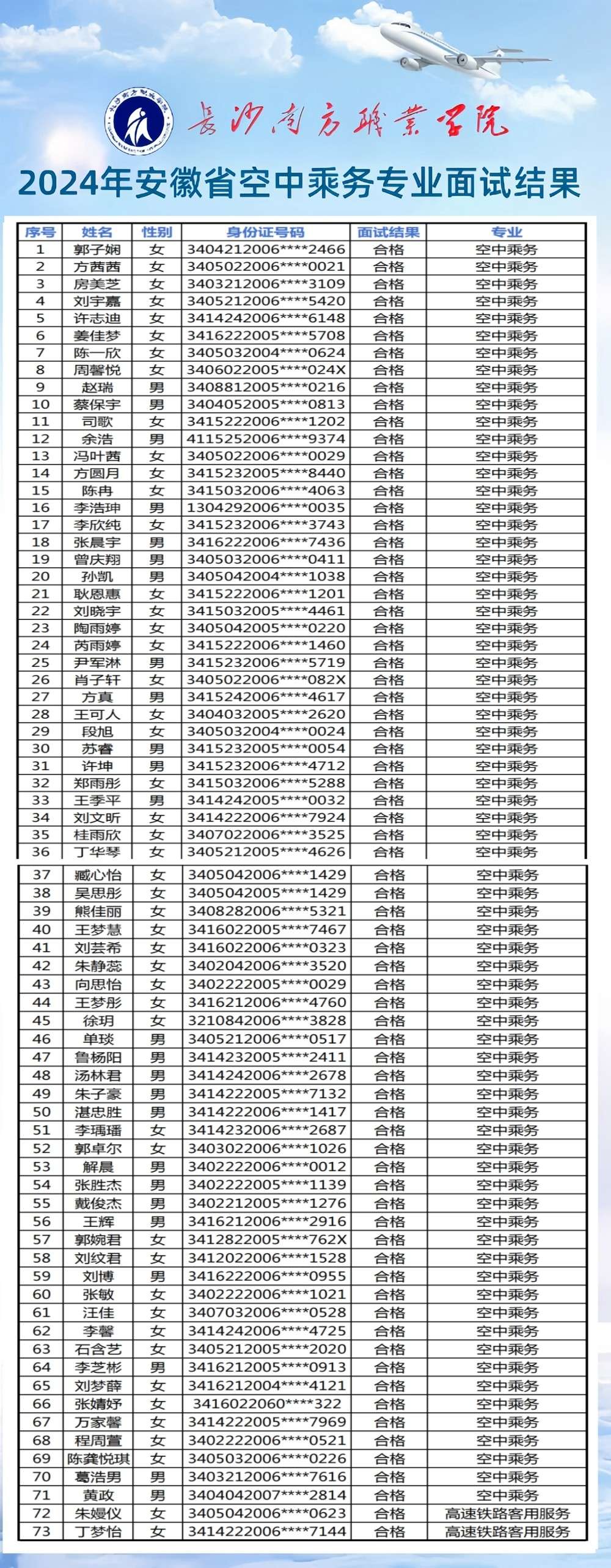长沙南方职业学院2024年安徽省空中乘务专业面试结果