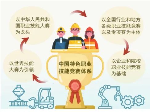 答:我国不断健全职业技能竞赛制度,初步建成了以世界技能大赛为引领、中华人民共和国职业技能大赛为龙头、全国行业和地方各级职业技能竞赛以及专项赛为主体、企业和院校职业技能竞赛为基础的中国特色职业技能竞赛体系。