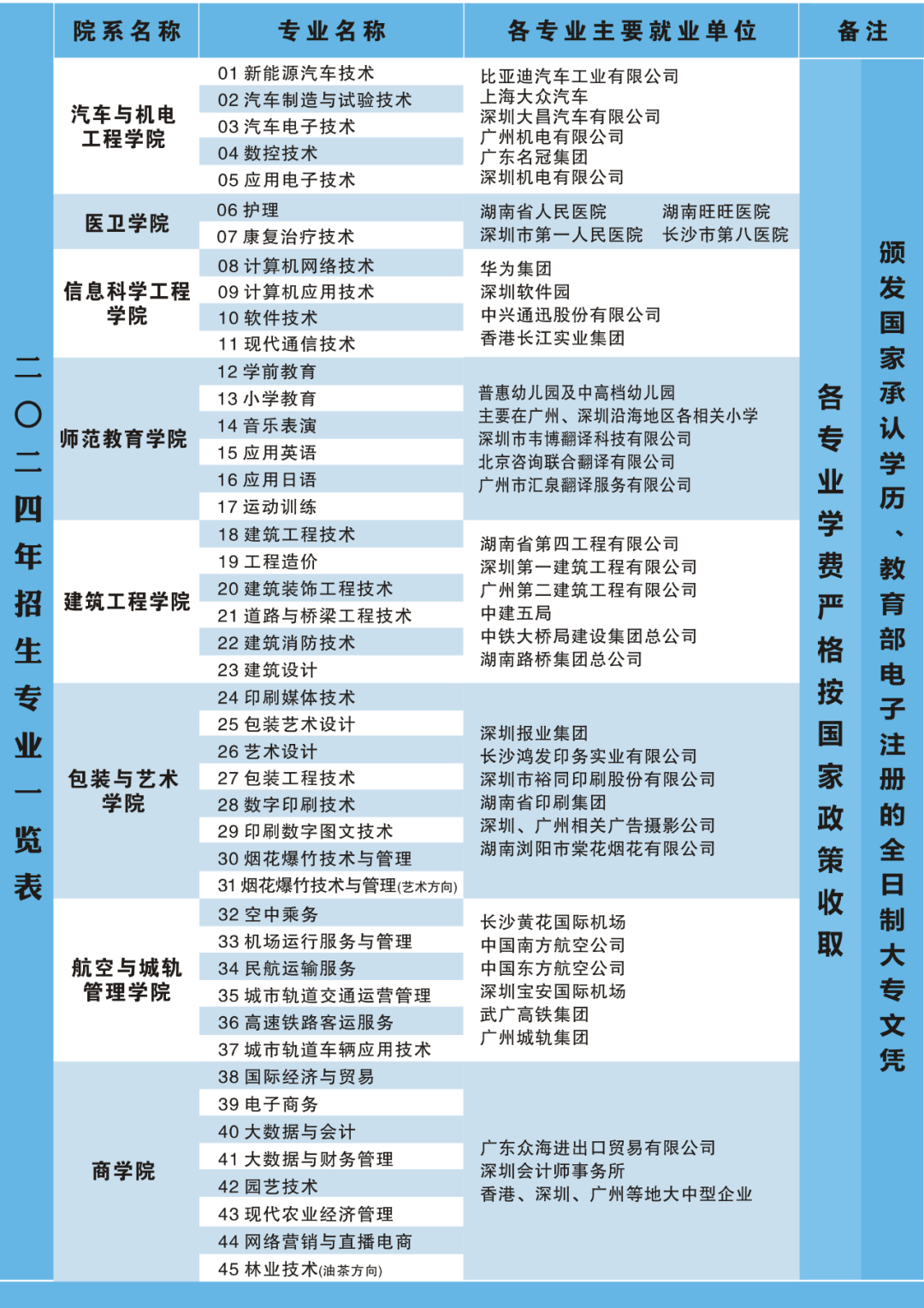 学院充分发挥地域优势、行业优势、专业优势,紧密结合市场需求,聚焦湖南“三高四新”战略,开设有空中乘务、城市轨道管理、护理、老年康复治疗技术、学前教育、小学教育、包装工程技术、印刷媒体技术、建筑工程技术、新能源汽车技术、汽车电子技术、国际经济与贸易、软件技术、计算机网络技术、应用英语、应用日语、运动训练、烟花爆竹技术与管理等45个专业,拥有新能源汽车实训基地、数控模具与电子实训基地、学前教育与小学教育实训基地、护理实训基地、建筑实训基地、印刷包装实训基地、航空服务与轨道交通实训基地等42个校内实训场所,并拥有105个校外实训基地。拥有包括现代化的教学楼、实训楼、多个国际标准跑道运动场、篮球场、驾校、多功能学生活动中心、学生电梯公寓、超市、食堂、商业街等完善的教学、运动、生活基础设施。教学楼、宿舍等场地全部安装空调,室内冬暖夏凉。