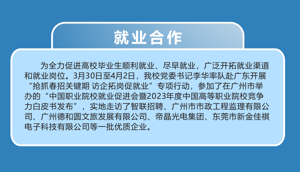学校积极创新“校企合作+工学结合+订单培养”人才培养模式,坚持立足长沙,面向全国,以服务为宗旨,以就业为导向,培养德智体美劳全面发展的高素质中、高级企业技术技能人才和管理人才,以及其他相关事业单位及国家公务员人才。紧密结合专业特色和市场需求,在北京、广州、深圳、上海、苏州、宁波等各地与200余家国内外知名企业深度融合、校企合作,实行订单培养,特别是为长株潭一体化建设提供强大的人力资源支持。毕业生就业率始终保持较高水平,并深得用人单位好评。