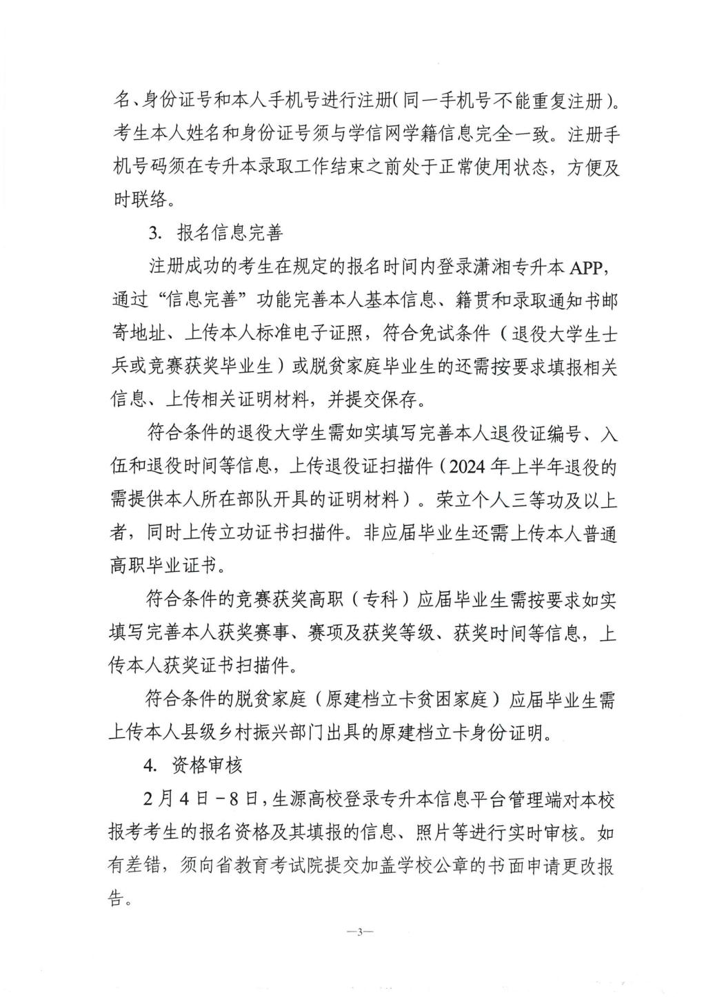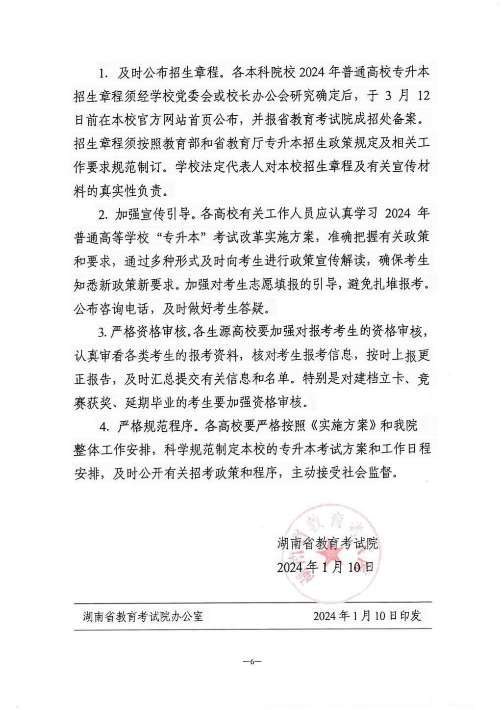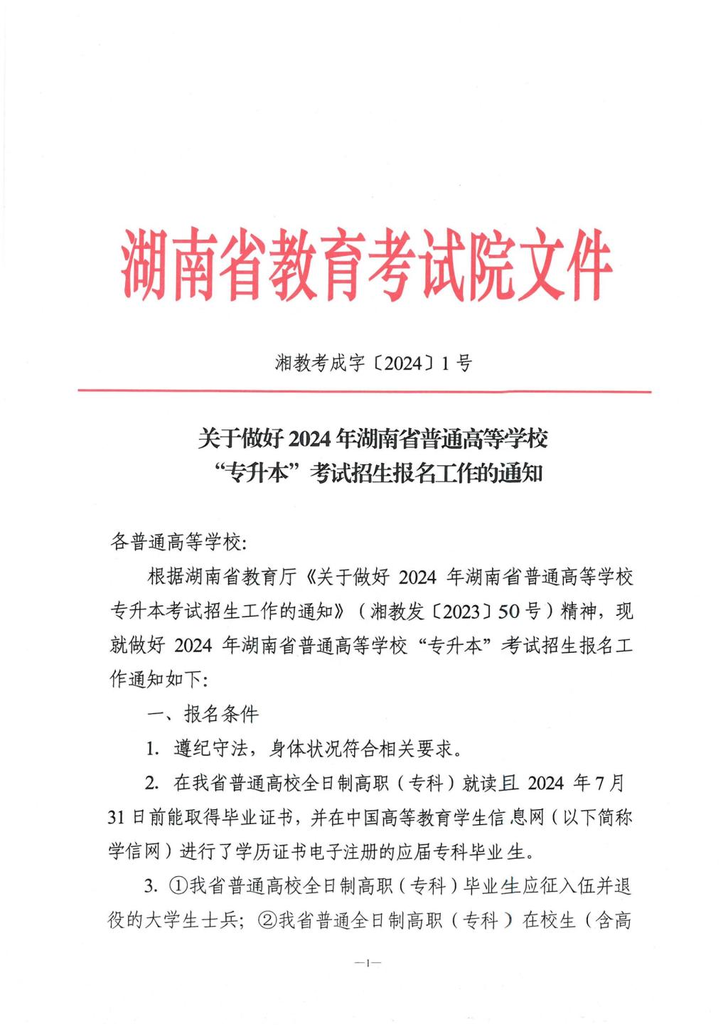 关于做好2024年湖南省普通高等学校“专升本”考试招生报名工作的通知 湘教考成字〔2024〕1号