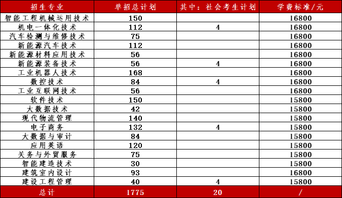 第八条2023年学校19个专业进行单独招生,单招总计划1775人,各专业具体招生计划和收费标准见下表。