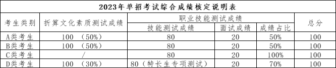 D类考生(体育、艺术特长生考生):文化素质测试成绩*30%+技能测试成绩(特长生专项测试)*70%,满分100分。