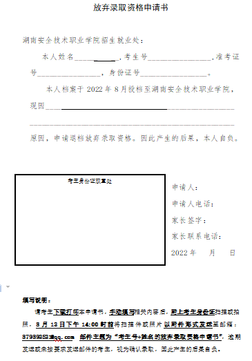 湖南省高职专科(平行一志愿)批次拟投档到湖南安全技术职业学院需退档的考生,可在8月13日14:00前将退档申请(见附件)发送至邮箱:879893531@qq.com,邮件名为“退档申请+考生号+姓名”,未按时和按要求发送退档申请的考生视为确认录取,逾期不再办理退档手续。退档模板如下: