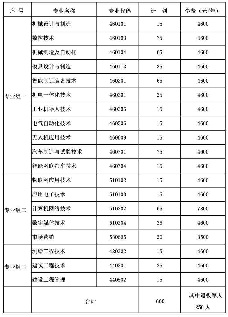 第十一条我校2023年单招总计划为600人,学制三年,具体单招专业、计划和收费标准如下表。
