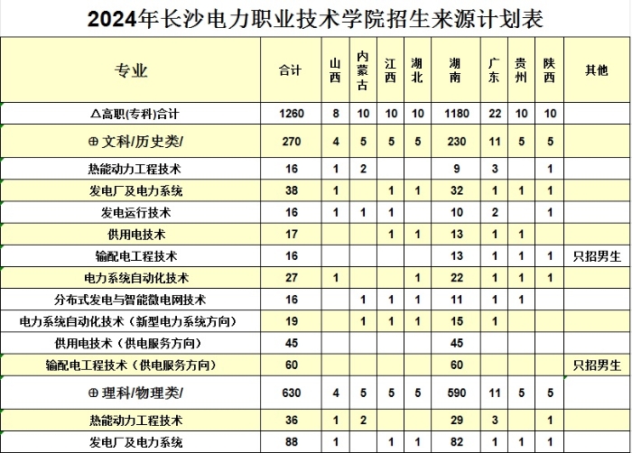 2024年长沙电力职业技术学院招生来源计划表