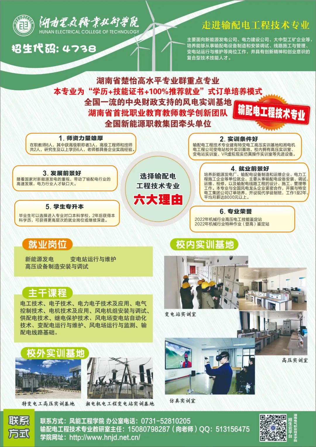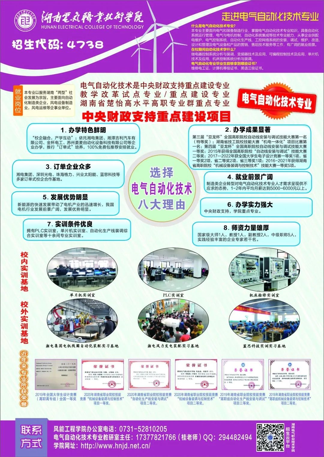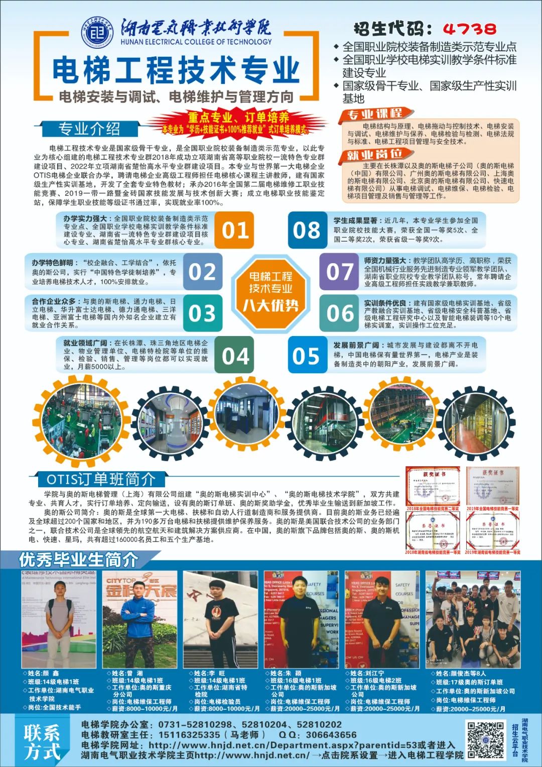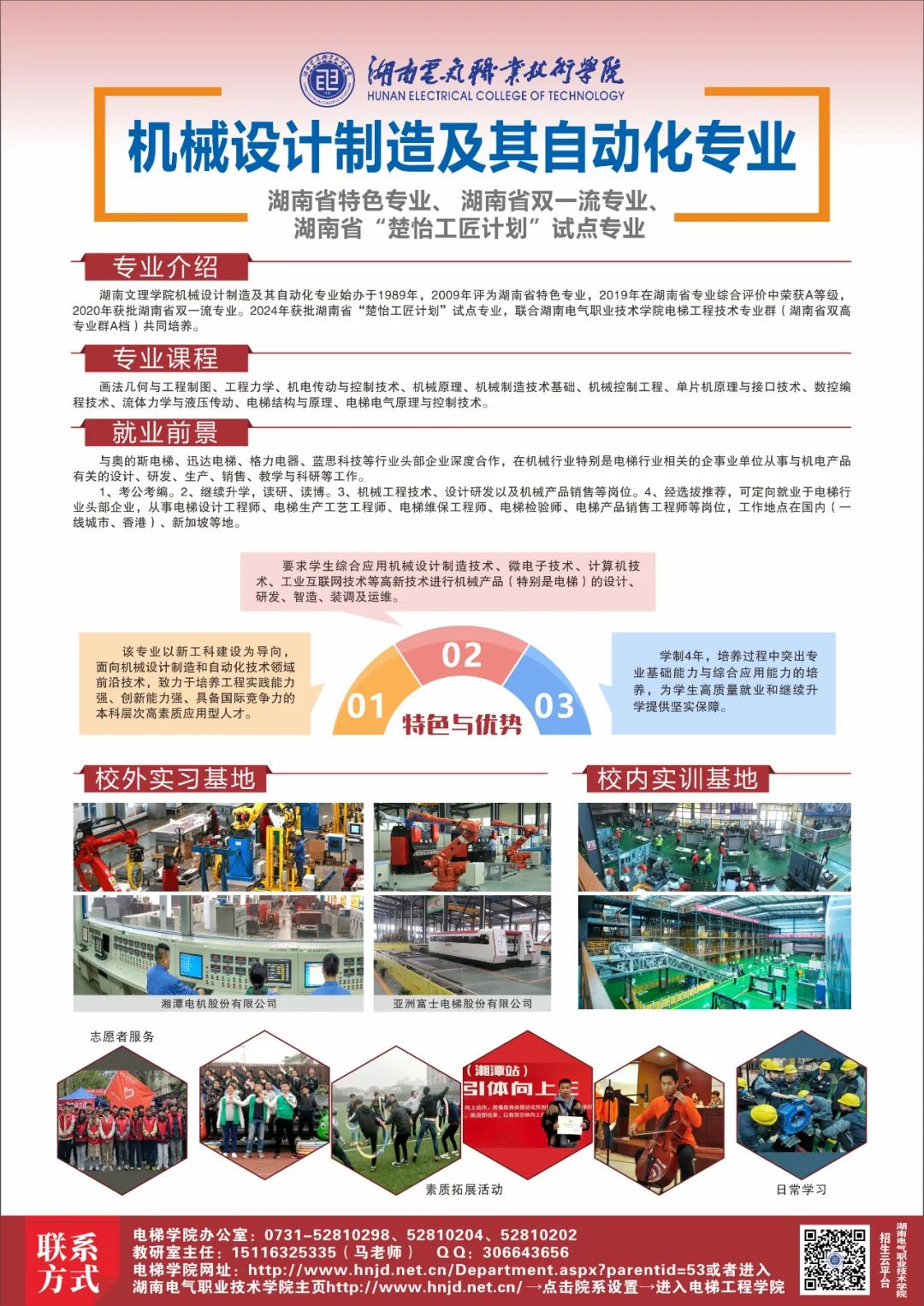 湖南电气职业技术学院始建于1941年,是湖南省人民政府批准、教育部备案的公办全日制高等职业院校,是湖南省示范性高职院校、湖南省楚怡“双高计划”建设单位、湖南省“楚怡工匠计划”试点高校。现设6个教学院部,开设21个招生专业,在校生10000余人,教职工400余人,其中高级专业技术职务的教师占比为33%,专任教师研究生以上学位比例达80.3%。学院是全国机械行业骨干高职院校、全国机械行业校企合作与人才培养优秀职业院校、全国机械行业合作培养高素质技能人才创新建设院校、全国职业院校魅力校园、全国五四红旗团委、国家首批高技能人才培训基地、全国首批示范性职业教育集团(联盟)培育单位、全国心理健康产教融合共同体副理事长单位、教育部“智能制造产业领域现代学徒试点项目”建设单位、湖南省文明高校、湖南省文明单位、湖南省文明校园。曾2次荣获国家职业教育教学成果奖,拥有1个国家级示范性职业教育集团,1个国家级教师教学创新团队,2个全国党建工作样板支部,1个国家级众创空间,2个省一流特色专业群,2个湖南省高水平专业群,3个省级教学创新团队,1个省级工程研究中心。电梯工程学院