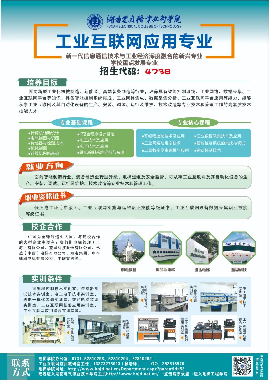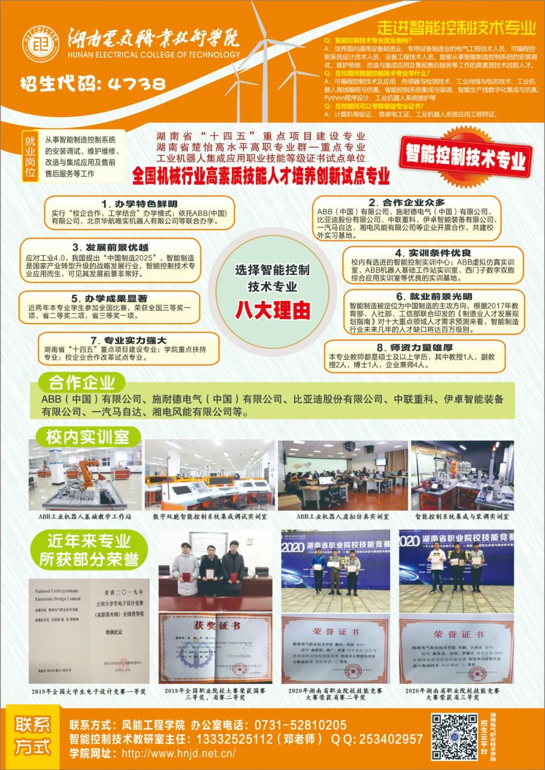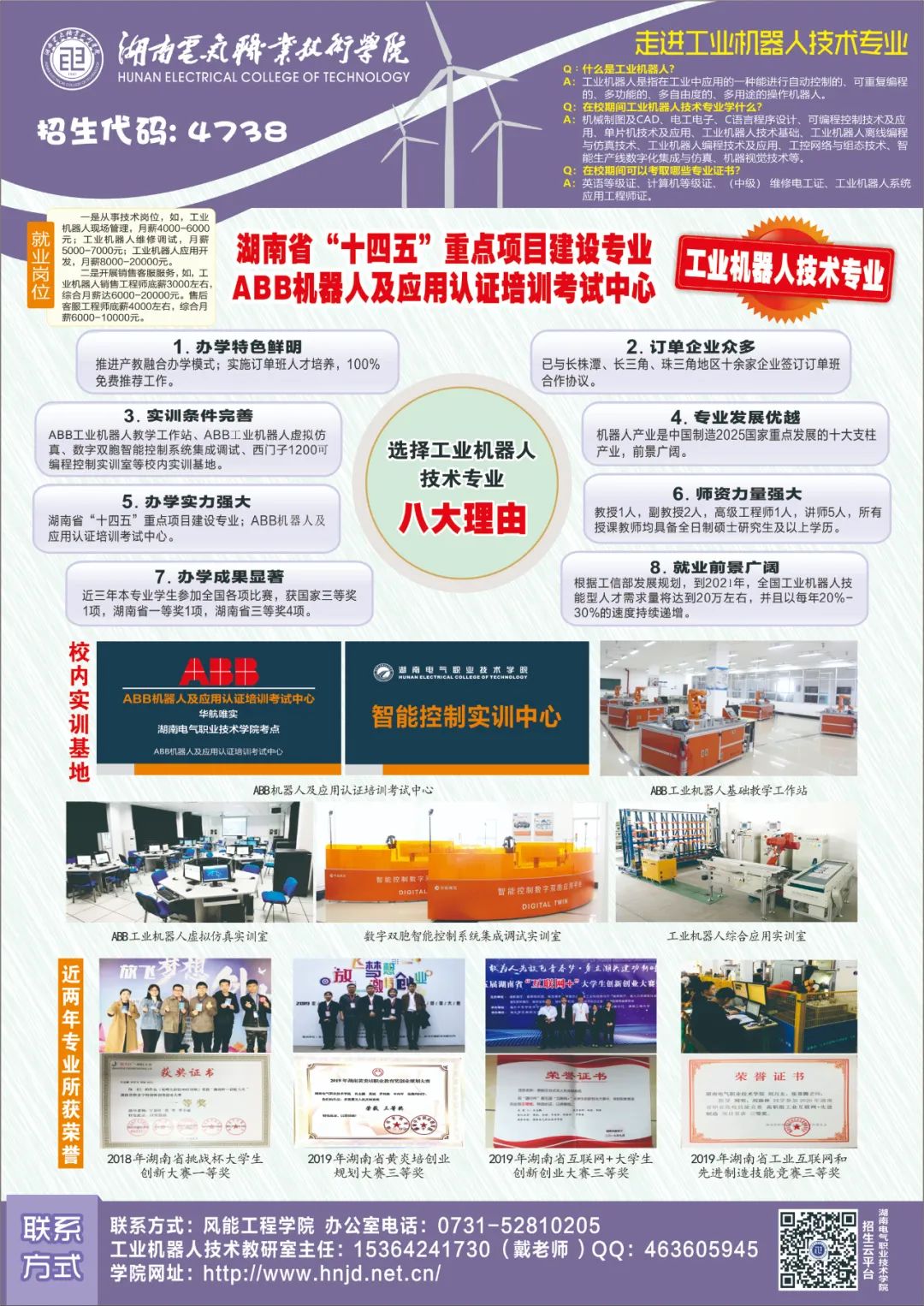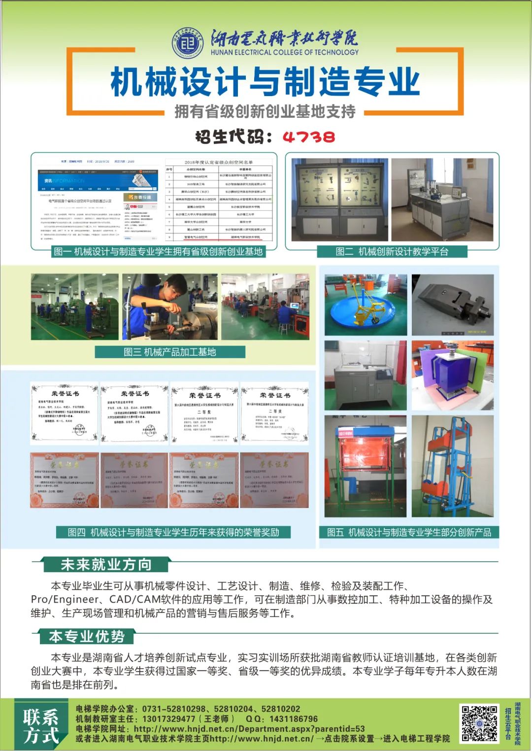 湖南电气职业技术学院始建于1941年,是湖南省人民政府批准、教育部备案的公办全日制高等职业院校,是湖南省示范性高职院校、湖南省楚怡“双高计划”建设单位、湖南省“楚怡工匠计划”试点高校。现设6个教学院部,开设21个招生专业,在校生10000余人,教职工400余人,其中高级专业技术职务的教师占比为33%,专任教师研究生以上学位比例达80.3%。学院是全国机械行业骨干高职院校、全国机械行业校企合作与人才培养优秀职业院校、全国机械行业合作培养高素质技能人才创新建设院校、全国职业院校魅力校园、全国五四红旗团委、国家首批高技能人才培训基地、全国首批示范性职业教育集团(联盟)培育单位、全国心理健康产教融合共同体副理事长单位、教育部“智能制造产业领域现代学徒试点项目”建设单位、湖南省文明高校、湖南省文明单位、湖南省文明校园。曾2次荣获国家职业教育教学成果奖,拥有1个国家级示范性职业教育集团,1个国家级教师教学创新团队,2个全国党建工作样板支部,1个国家级众创空间,2个省一流特色专业群,2个湖南省高水平专业群,3个省级教学创新团队,1个省级工程研究中心。电梯工程学院