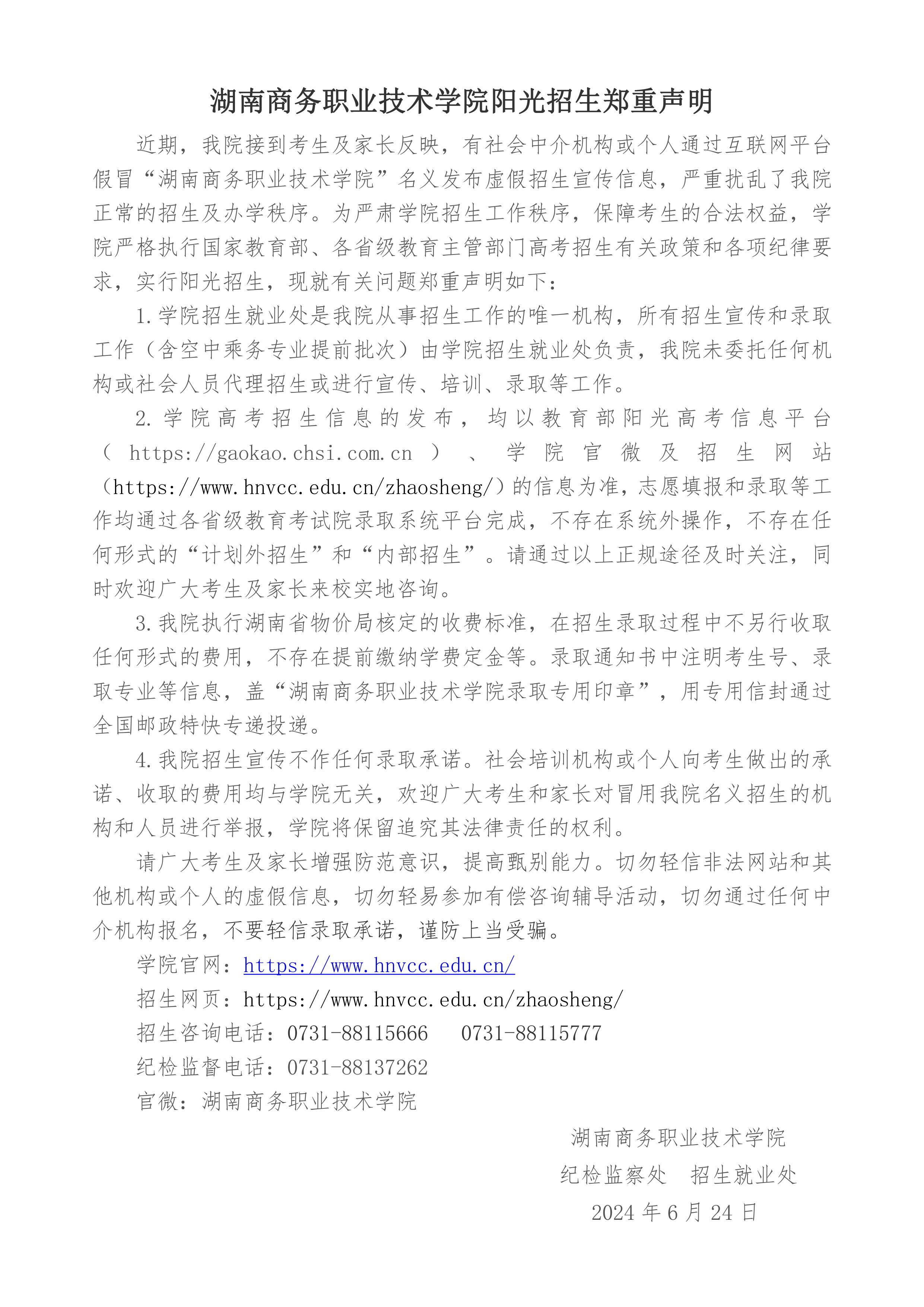 湖南商务职业技术学院阳光招生郑重声明