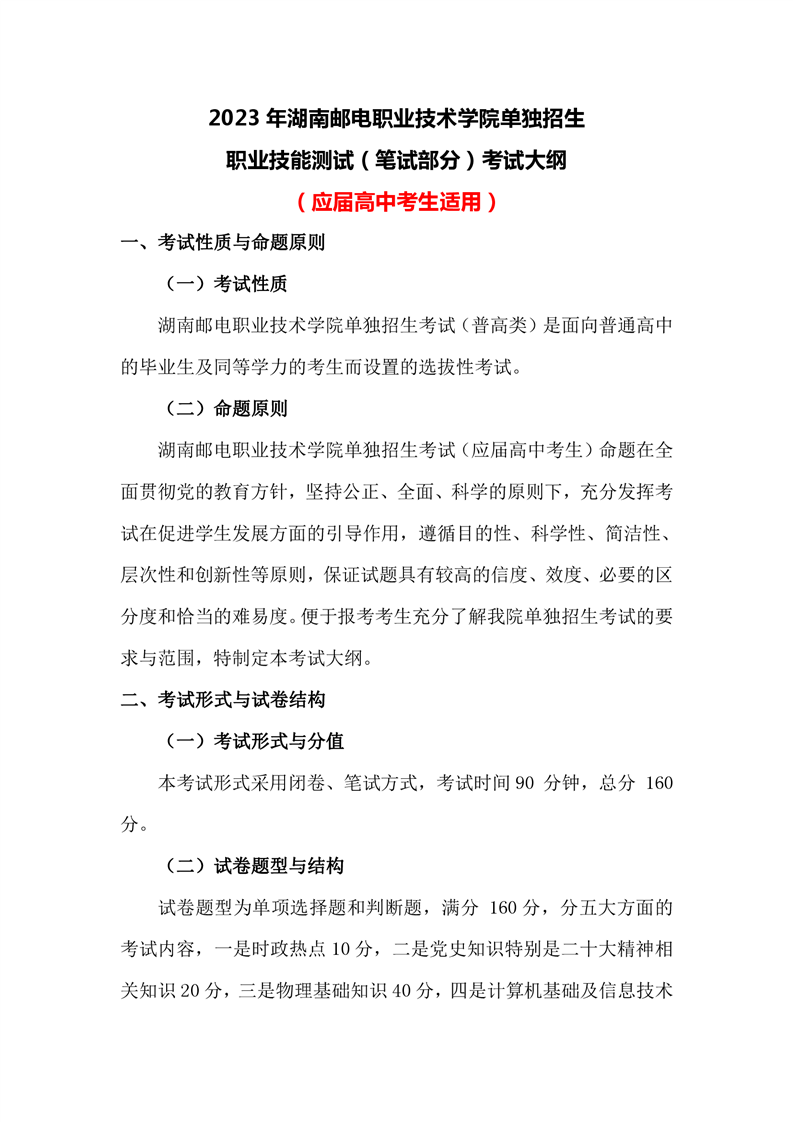 2023年湖南邮电职业技术学院单独招生考试职业技能测试大纲及样题(应届普高)