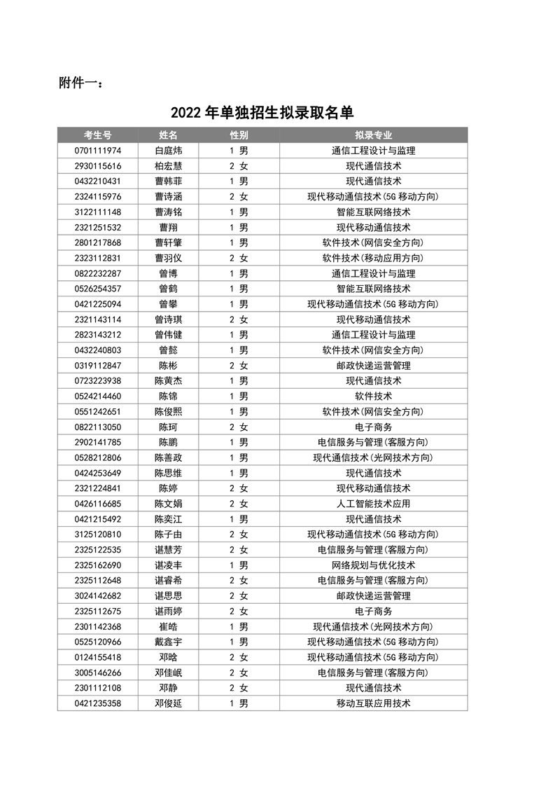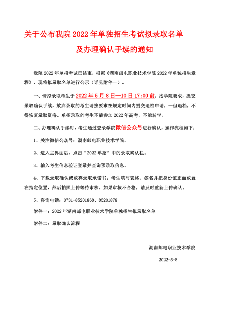 2022年湖南邮电职业技术学院单招拟录取名单及录取确认流程