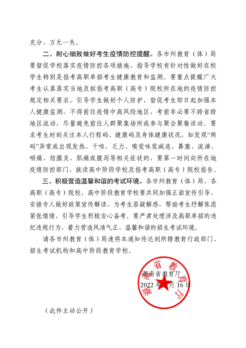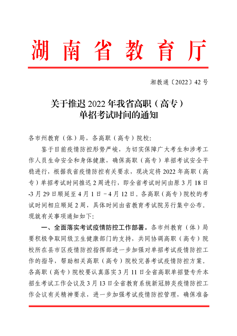 湘教通〔2022〕42号 关于推迟2022年我省高职单招考试时间的通知