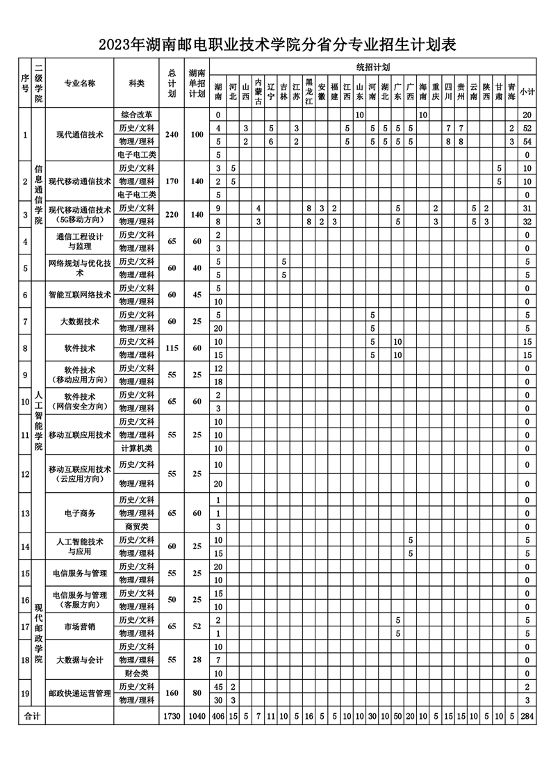 2023年湖南邮电职业技术学院分省分专业招生计划