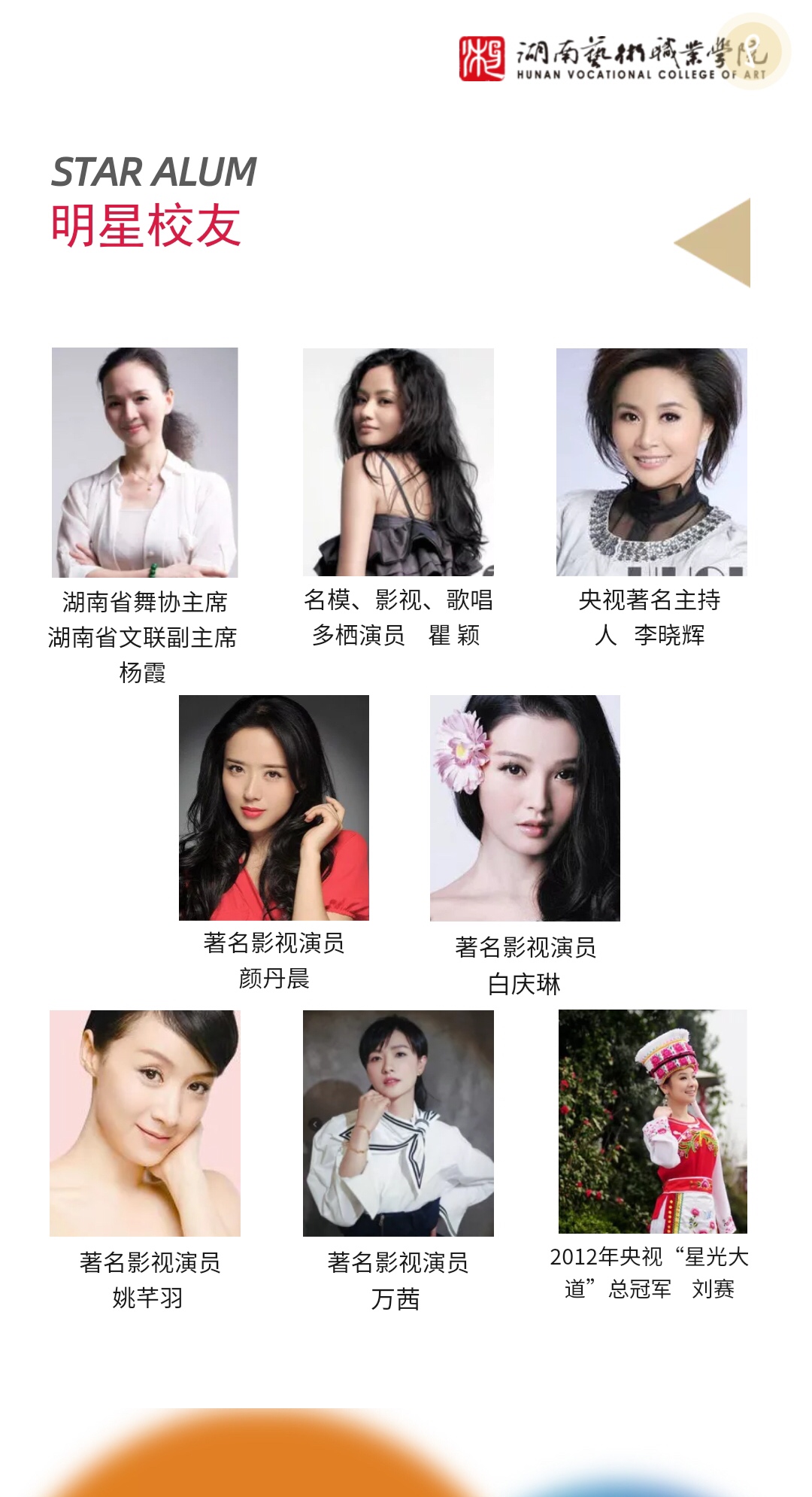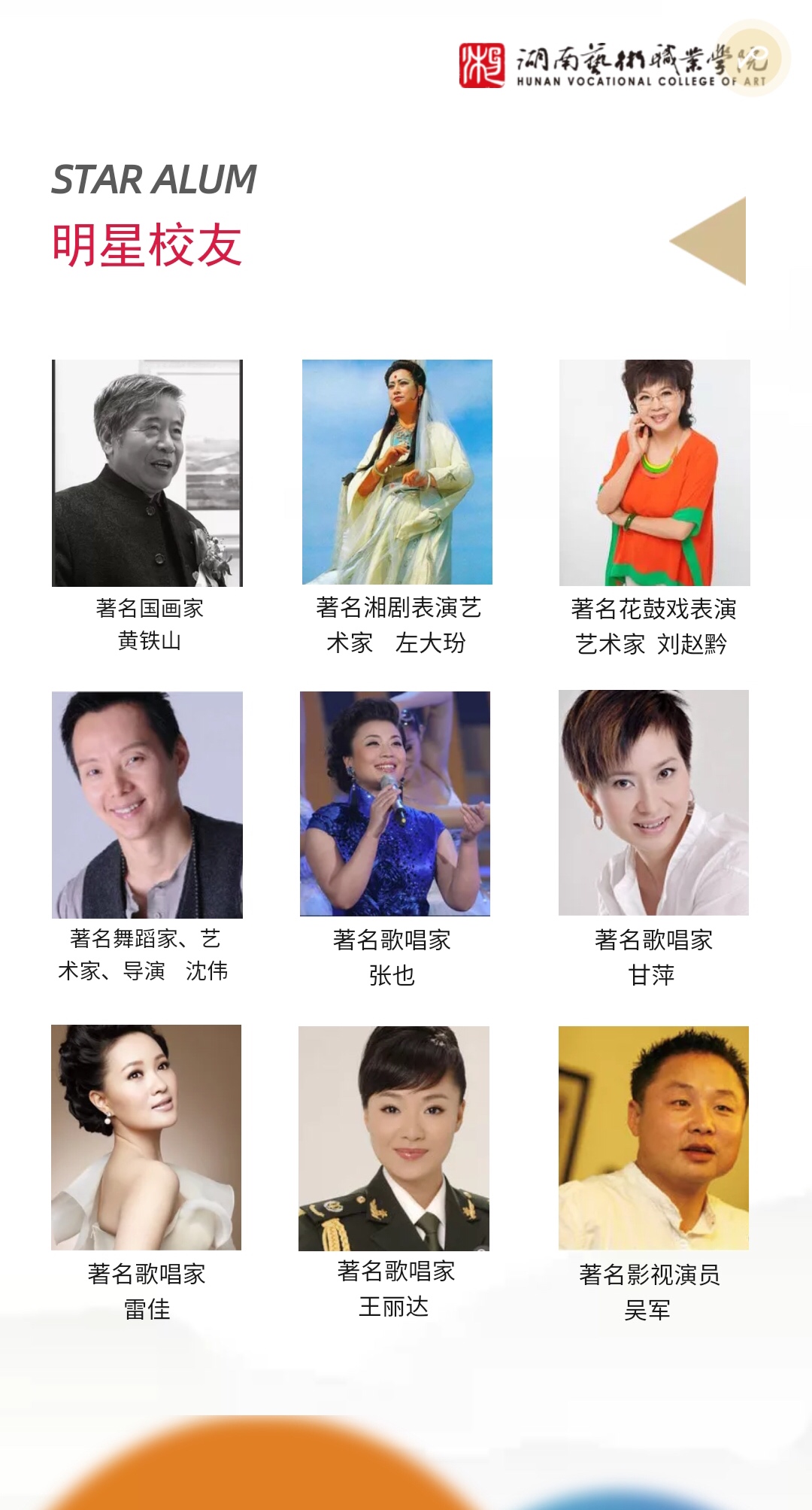 湖南艺术职业学院是国家公办艺术类高等院校。有近70年办学历史,是湖南省示范性高等职业学院、湖南省文明高等学校、文化和旅游部湖南培训基地、全国非遗传承人群研培基地,先后荣获全国文化工作先进集体、全国学校艺术教育先进单位、湖南省职业教育先进单位等荣誉。