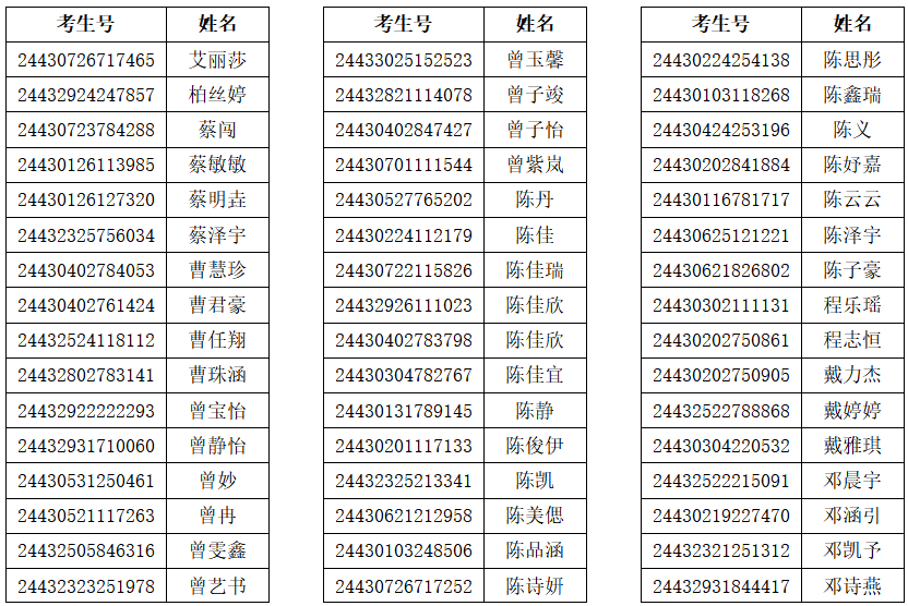 考生号 | 姓名 | 考生号 | 姓名 | 考生号 | 姓名 |