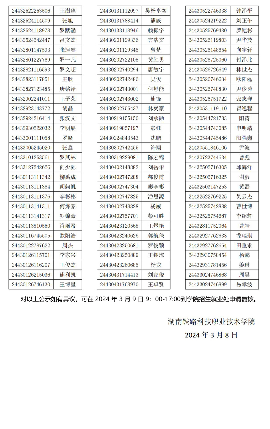 2024年湖南铁路科技职业技术学院单独招生报名于2024年3月5日结束。经过学院考生资格审查小组按照《湖南铁路科技职业技术学院2024年单独招生章程》要求,对报考考生资格进行审查,招生工作领导小组审核通过。现将审核结果予以公示。