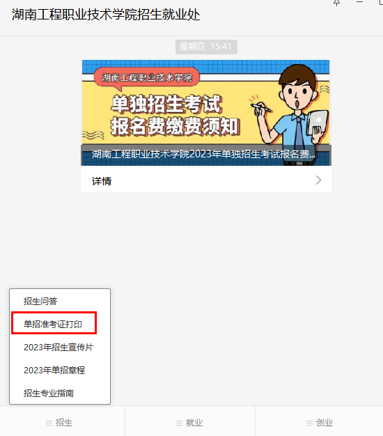 2024年单招考试准考证打印操作指南第1步:关注湖南工程职业技术学院招生就业处微信公众号