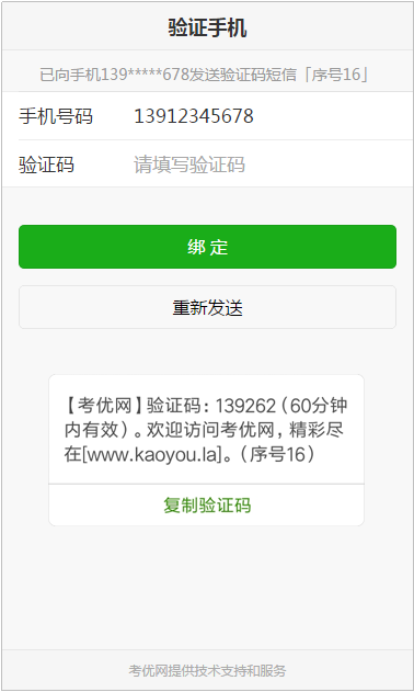 系统向考生手机发送随机验证码短信,考生收到验证码短信后,填写收到的验证码完成验证。