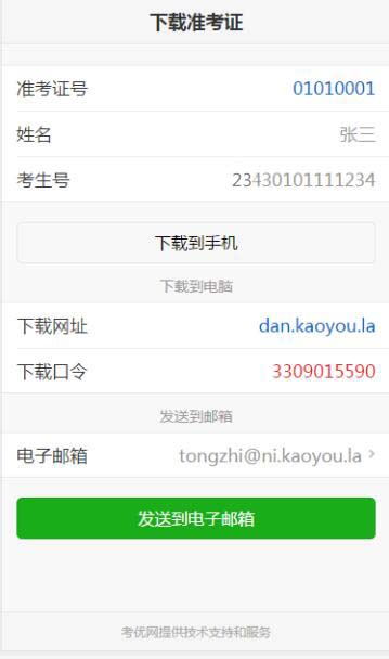 验证完成后,点击“打印准考证”按钮可以下载准考证,下载提供三种方式:下载到手机、下载到电脑、发送到电子信箱。