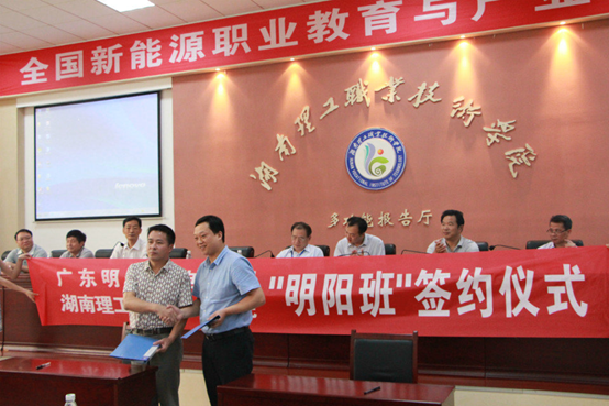 2015年5月,全国新能源职业教育产业发展对话会在我校举行。本次产业对话会的召开推进了我校职业教育与新能源产业发展的直接对接,进一步深化了校企合作。对话会上,我校与明阳智能在建立长效共赢机制方面达成共识,签订了校企合作订单培养协议。
