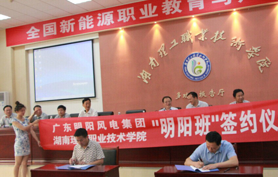 2017年4月,我校与明阳智能签订联合办学协议,双方商定共同建立长期联合培养人才的战略联盟。当天,明阳智能“中部地区培训基地”在我校正式挂牌成立,标志着明阳智能校企合作项目向更深层次迈进了一大步。