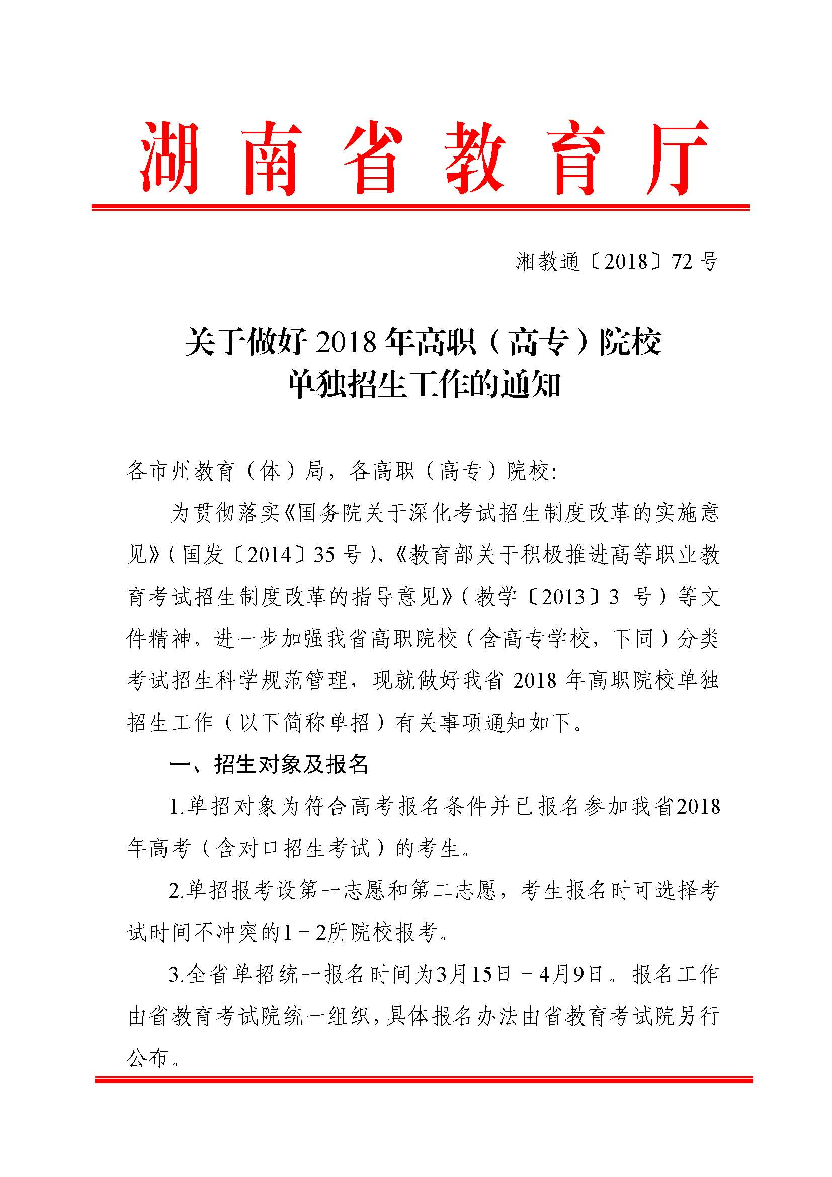 关于做好2018年高职(高专)院校单独招生工作的通知