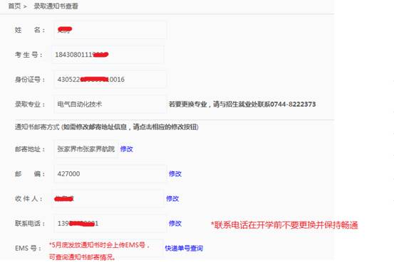 点击“去查看”,可查看自己录取通知书相关信息,若专业不对,请与招生就业处联系0744-8222373;如需修改通知书邮寄信息,请点击相应“修改”按钮进行修改,若都正确,则不需操作。5月底发放通知书时会上传邮政的EMS快递单号,供查询通知书的邮寄状态。
