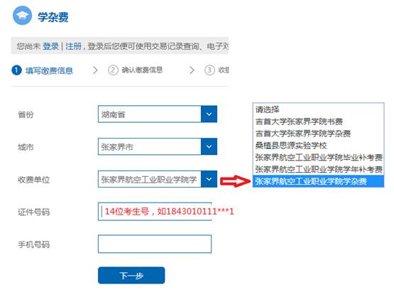 在建设银行的缴费页面中选择湖南省、张家界市,收费单位选张家界航空工业职业技术学院学杂费(4月25日-5月1日),输入14位考生号,进入下一步。