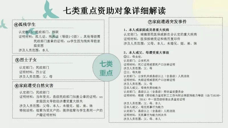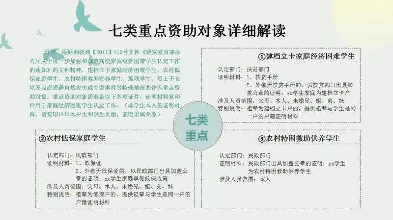 根据湘教通【2017】216号文件《转发教育部办公厅关于进一步加强和规范高校家庭经济困难学生认定工作的通知》的文件精神,建档立卡家庭经济困难学生、农村低保家庭学生、农村特困救助供养学生、孤残学生、烈士子女以及家庭遭遇自然灾害或突发事件等特殊情况的作为重点资助对象。重点资助对象需准备以下各项证件、证明材料复印件用于家庭经济困难学生认定工作。(非学生本人的证明材料,请复印户口本户主和学生页面,证明亲属关系)。