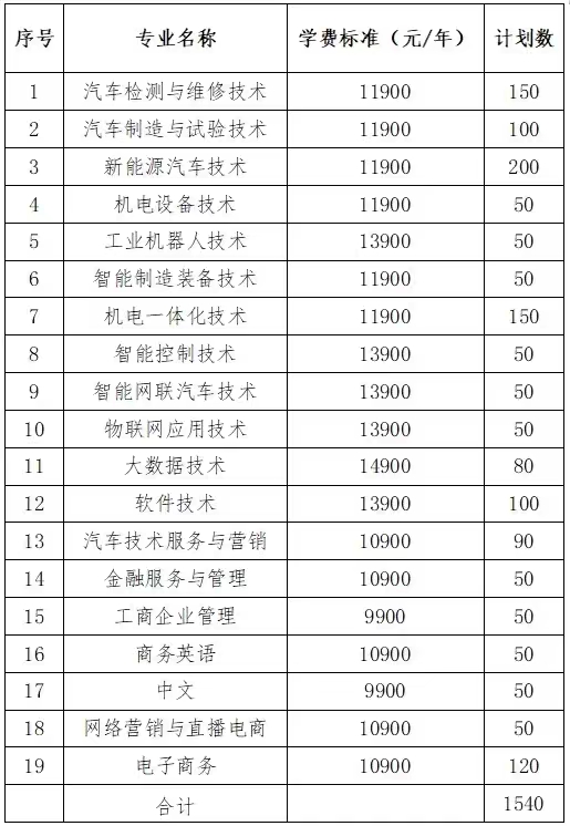 第十一条我校2024年单招总计划数为1540人,其中包含单列计划的退役军人10 人、其他社会人员 10人。本校2024年招生专业共 19个。分专业单招计划及学费标准如下表,各专业最终学费标准以2024年湖南省物价主管部门审核为准。