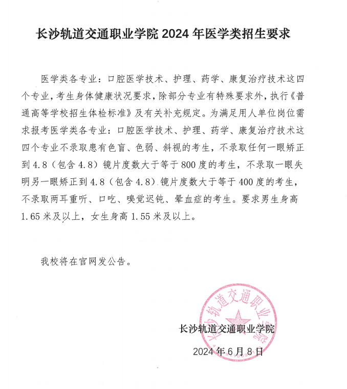 2024年长沙轨道交通职业学院医学类招生章程补充