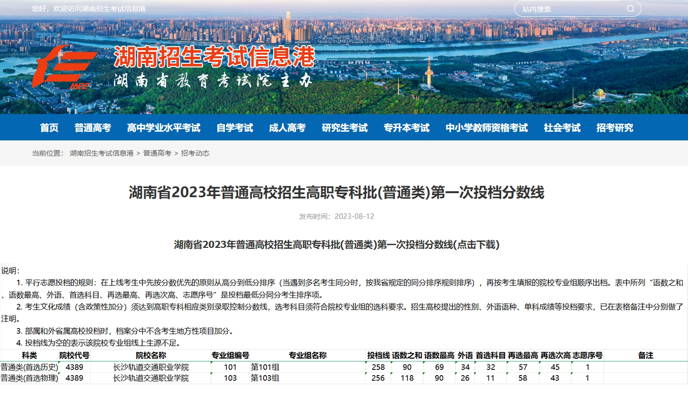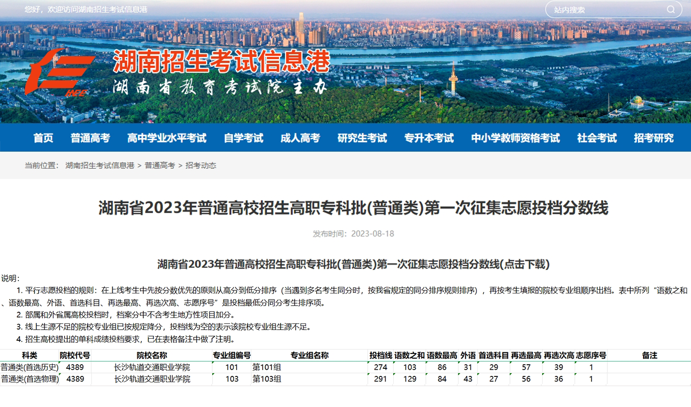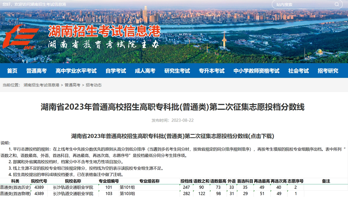2023年长沙轨道交通职业学院统招志愿填报录取投档线公布