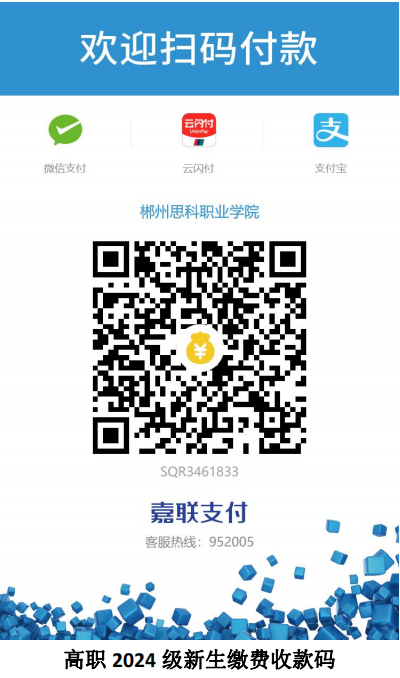 各位2024级新生:学校为便于提前规划和分配住宿资源,确保住宿设施的有效利用,决定对2024级新生实行预收住宿费。具体事宜如下:一、注意事项1、请要预缴住宿费的新生以学院官网和微信公众号发布的“关于郴州思科职业学院2024级新生“交500抵1000”预收住宿费的通知”为准。2、单招考生根据个人需求在规定时间内通过微信公众号预缴住宿费。3、统招考生通过学校官网或微信公众号发布的付款二维码预缴住宿费。4、预缴住宿费时必须用学生本人姓名、身份证号等信息进行预缴,用父母或其他人员信息无效。5、每生在填报志愿前预缴500元住宿费,预定床位;新生报到时,根据预缴住宿费信息,直接冲抵1000元住宿费。6、 财务部门及时核对缴费信息,确保费用准确入账,并及时汇总预收住宿费考生名单。7、 单招考生在郴州思科职业学院公众号上查看打印缴费电子凭证,统招考生付款码缴费后截图交易码作为凭证。二、预缴时间2024年6月10日至8月5日。三、预缴步骤1、单招学生:关注公众号“郴州思科职业学院”→ 报名缴费 → 单招缴费 →学生缴费 →输入考生身份证号码→学生立即缴费→选择缴费项目(点击住宿费,修改金额为500元)→提交。2、统招学生:直接扫图中二维码即可完成缴费。步骤:微信或手机银行扫码二维码→输入金额(500元) →完善个人信息(学生姓名、毕业学校、意向专业→确认支付