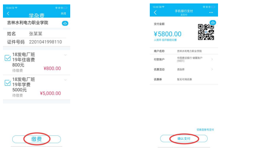 (5)核对确认后点击“缴费”,再次核对后,确认支付。(各专业不同,缴费标准不同,请以实际情况为准。)