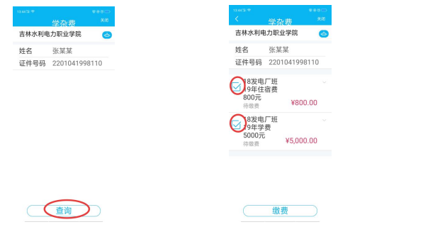 (4)扫描后填写缴费学生的姓名和身份证号,查询需缴费项目,并勾选相应项目。