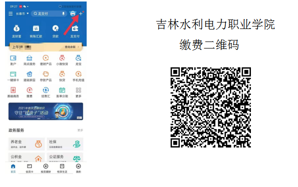 (3)用中国建设银行APP“扫一扫”功能,(不要用微信扫!不要用微信扫!不要用微信扫!用微信扫会有超过限额的问题)扫描吉林水利电力职业学院缴费二维码。