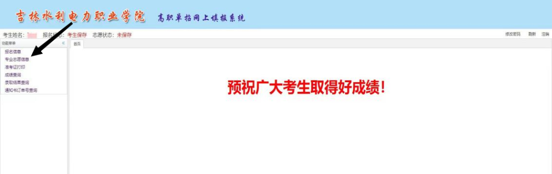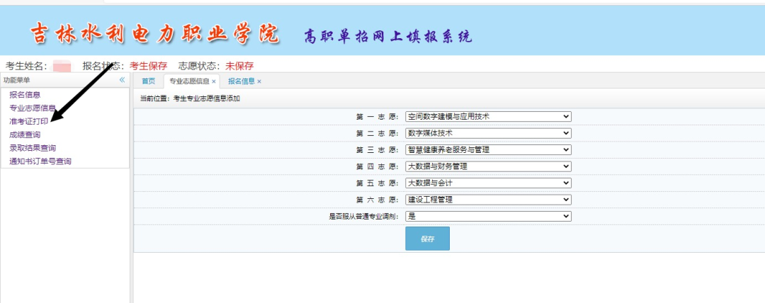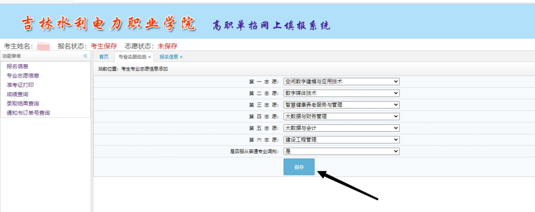 第六步:输入用户名密码(身份证后六位)进入报名系统,填报本人志愿信息点击保存。(请及时修改密码,考生务必记住本人密码,成绩查询和录取查询都要使用该密码。)