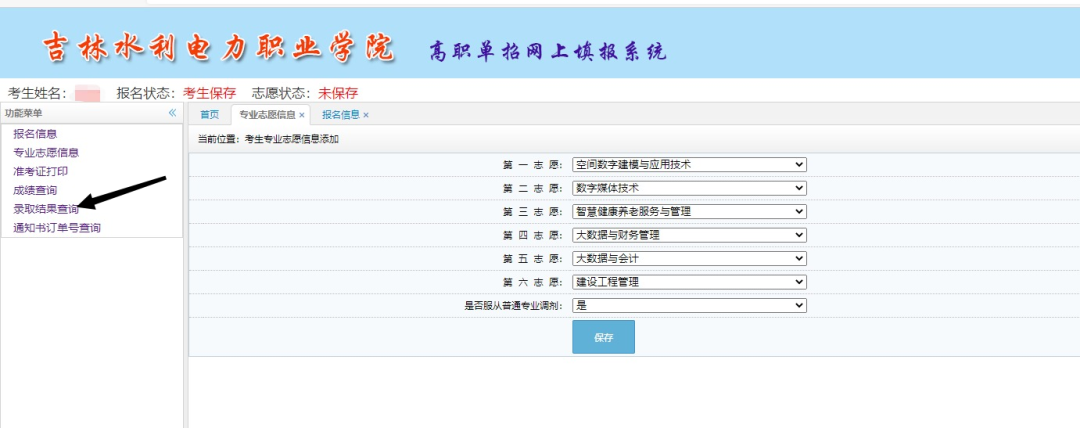 登录学院报名网址,点击右侧第二步进入报名系统,点击系统左侧录取结果查询。