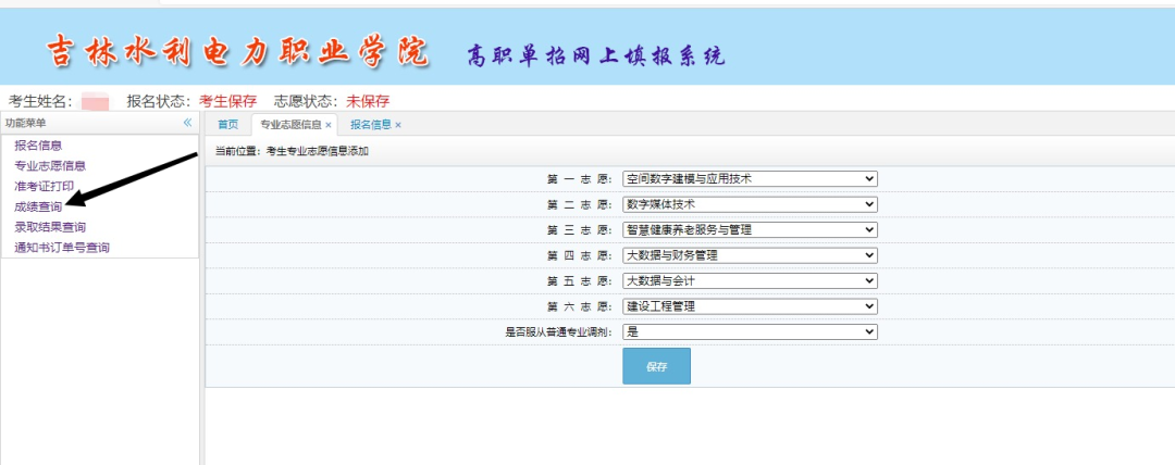 登录学院报名网址,点击右侧第二步进入报名系统,点击系统左侧成绩查询。
