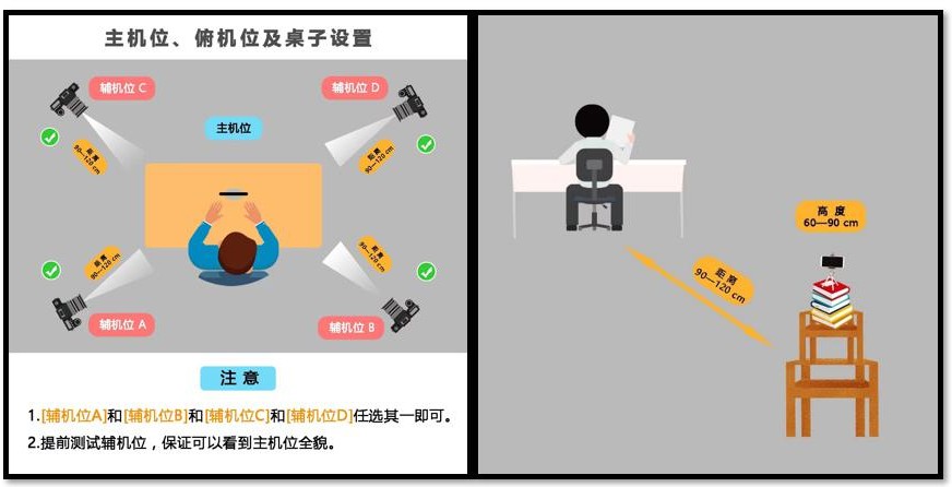 考试采用“双机位”进行,考前需准备2台智能手机,要求前后摄像功能清晰,上网功能顺畅。