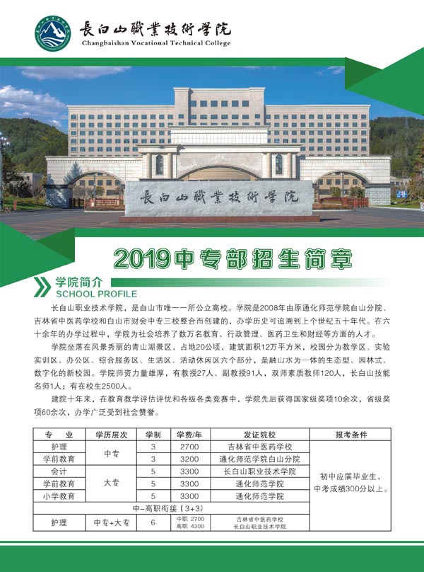 长白山职业技术学院,是白山市唯一一所公立高校。学院是2008年由原通化师范学院白山分院、吉林省中医药学校和白山市财会中专三校整合而创建的,办学历史可追溯到上个世纪五十年代。在六十余年的办学过程中,学院为社会培养了数万名教育、行政管理、医药卫生和财经等方面的人才。 学院坐落在风景秀丽的青山湖景区,占地20公顷,建筑面积12万平方米,校园分为教学区、实验实训区、办公区、综合服务区、生活区、活动休闲区六个部分,是融山水为一体的生态型、园林式、数字化的新校园。学院师资力量雄厚,有教授27人、副教授91人,双师素质教师120人,长白山技能名师1人;有在校生2500人。 建院十年来,在教育教学评估评优和各级各类竞赛中,学院先后获得国家级奖项10余次,省级奖项60余次,办学广泛受到社会赞誉。