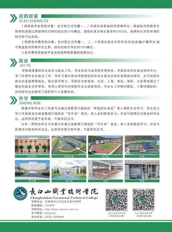 学院高度重视学生的实习就业工作。学生的实习由学院负责安排。学院设有学生就业指导中心,专门负责毕业生就业工作,学生可通过参加学院组织的毕业生就业洽谈会选择就业岗位,亦可由招生就业处直接推荐就业。经过多年努力,学院在吉林省内、北京、上海、青岛、深圳、太连等地建立了稳定的就业合作单位,各用人单位均对我院毕业生反映良好,毕业生工作相对稳定,工薪待遇较好。同时给毕业生提供了较好的个人发展空间。 升 学 普通中职学生在三年级可以通过省教育厅组织的“单独招生考试”考入本院高职专业学习。学生在大学三年级参加吉林省教育厅组织的“专升本”考试,考入本科院校学习;毕业可获得全日制本科毕业证,达到学位授予条件者,可获学位证书。 五年一贯制的学生可在第五年通过省教育厅组织的“专升本”考试,考入本科院校学习;毕业可获得全日制本科毕业证,达到学位授予条件者,可获学位证书。