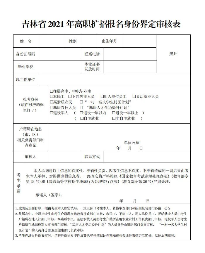 附件1:《吉林省2021年高职扩招报名身份界定审核表》