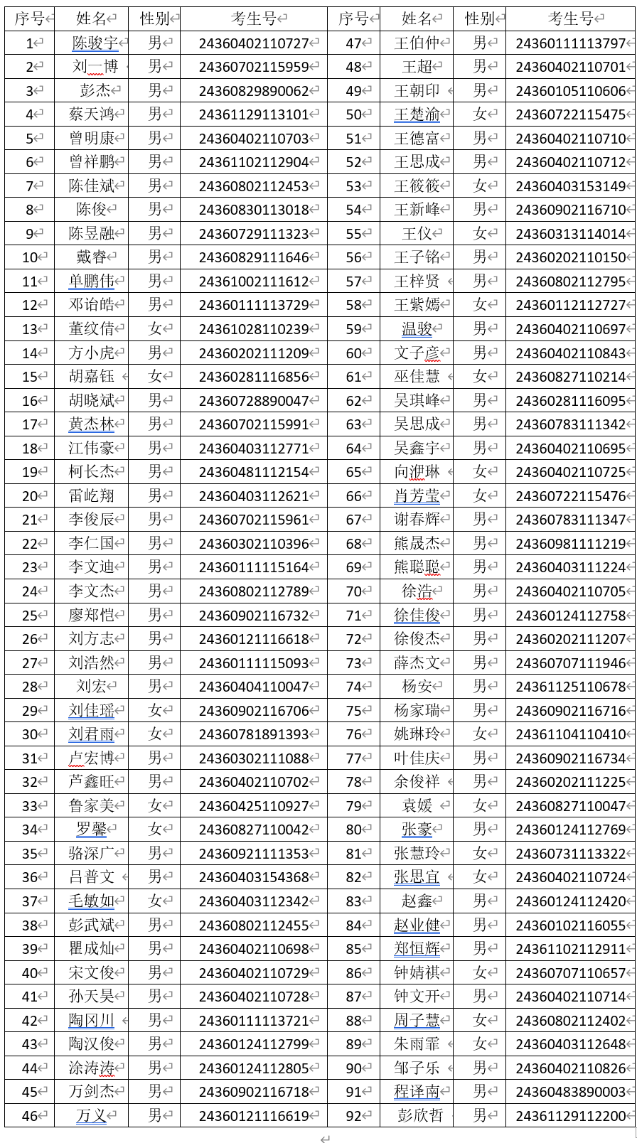 根据《江西财经职业学院2024年单独招生工作实施方案》第八条“免试政策”相关规定,我校认真进行符合免试条件的证书等电子材料初审工作,通过审核92人,复审时考生现场提供的原件必须与初审电子材料内容相同,否则将被取消免试录取资格。现将第1专业志愿报考体能训练的单招考生免试录取名单进行公示,公示期3天(3.12-3.14),如有异议,请联系刘老师15070262317。