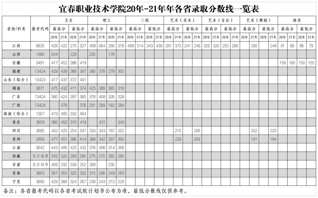 宜春职业技术学院2020-2021年各省录取分数线一览表