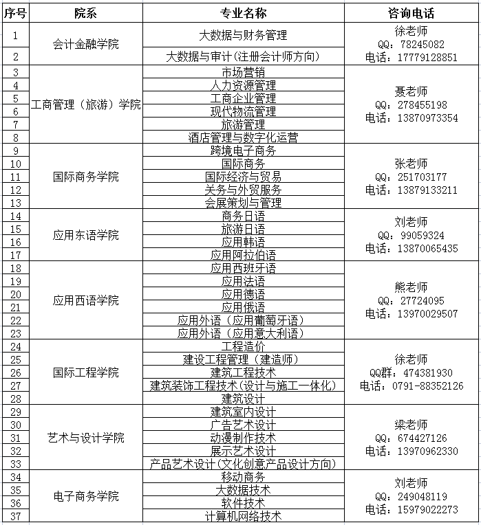 2、招生专业:招生专业37个,学制3年,培养地点在江西外语外贸职业学院,具体如下: