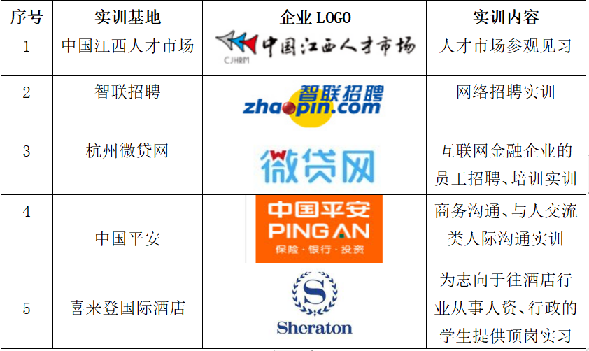 人才市场参观见习、员工模拟招聘与培训实战演练、客户沟通能力训练、劳动法律操作实务、商务文印社实操演练等。