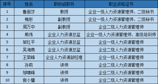 本专业有专兼职教师13人,其中企业人资总监兼职5人,专业现有教学名师4位,名单如下: